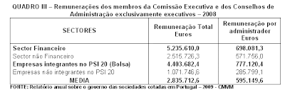 O ano de 2008, foi um ano grave para todo o sistema financeiro devido a uma gestão irresponsável que atingiu, em muitos casos, ilegalidades, roubos, fraudes, etc., como sucedeu também em Portugal. No entanto, para os administradores dessa mesma banca em crise, não houve crise que atingisse as suas remunerações. O quadro seguinte, construído com dados constantes de um relatório, elaborado pela Comissão do Mercado de Valores Mobiliário (CMVM), sobre o governo das sociedades cotadas na bolsa, mostra que, mesmo num ano de crise, os administradores, receberam remunerações escandalosas, como se nada tivesse acontecido.