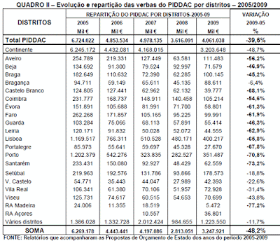 Se a análise for feita por distritos constata-se que os distritos mais afectados por cortes nas verbas para investimentos públicos foram precisamente alguns dos menos desenvolvidos. Entre 2005 e 2009, as verbas para investimento público constantes do PIDDAC diminuíram em – 56,2% para o distrito de Aveiro; em -46,9% para o distrito de Beja; em -45,2% para o distrito de Braga; em -68,1% para o distrito de Castelo Branco; em -61,3% para o distrito de Évora; em -46,3% para o distrito da Guarda; em -62,9% para o distrito de Leiria; em -73,2% para o distrito de Santarém; em -43,8% para o distrito de Viseu; e em -77,2% para a RA da Madeira; portanto, reduções todas elas superiores à diminuição do valor total do PIDAAC no mesmo período (2005/2009) que foi de -39,6% (Quadro II):
