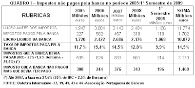 Até 2007, a taxa legal de imposto que a banca devia pagar era 27,5% (25% de IRC + 2,5% de derrama). A partir de 2007 a taxa de impostos baixou fixando-se em 26,5% (25% de IRC + 1,5% derrama. No entanto, a banca nunca pagou essa taxa. Em 2005, de acordo com dados divulgados pela Associação Portuguesa de Bancos, a taxa média efectiva paga pela banca foi apenas de 11,7%. Em 2006, como consequência de uma forte denuncia feita na Assembleia da República, aquando do debate do OE2006 em Dezembro de 2005, em que também participamos directamente, a taxa subiu para 19,4%. Mas foi “sol de curta duração” apesar das declarações solenes, tanto de Sócrates como do seu ministro das Finanças, de que a situação iria mudar, pois a taxa efectiva de imposto paga pela banca baixou para 14,5% em 2007. Em 2008, tornou a descer para apenas 12,8% e, a previsão para 2009, é que ela continue a descer, pois os dados divulgados pela Associação Portuguesa de Bancos revelam que, relativamente aos lucros líquidos do 1º semestre deste ano, a banca prevê pagar uma taxa efectiva de imposto de apenas 9,9%.Para se poder ficar com uma ideia das receitas perdidas pelo Estado, e do ganho fácil que isso tem representado para os accionistas dos bancos, basta dizer que se, no período 2005-1ºSem2009, a taxa efectiva de imposto paga pela banca coincidisse com a taxa legal (27,5% até 2007; e 26,5% depois de 2007), o Estado teria arrecadado mais 1.468 milhões de euros de receitas que podiam ter sido utilizadas no apoio aos desempregados e no combate à pobreza mas que, no entanto, foram engrossar os elevados lucros da banca e, consequentemente, aumentar ainda mais os dividendos distribuídos todos os anos pela banca aos accionistas.