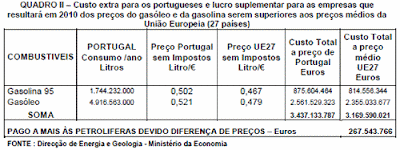 Como os preços sem impostos da gasolina e do gasóleo em Portugal são actualmente superiores aos preços médios da União Europeia, em 2010, os consumidores portugueses terão de suportar um acréscimo importante de despesa, o que determinará um lucro suplementar significativo para as empresas. No quadro seguinte procura-se quantificar esse custo extra para os consumidores e esse lucro suplementar para as empresas, utilizando no cálculo dados divulgados pela Direcção Geral de Energia do Ministério da Economia.