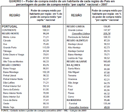 O INE divulgou no último trimestre de 2009 um “Estudo sobre o Poder de Compra Concelhio -2007” que confirma a profunda desigualdade que continua a existir entre portugueses a viverem nos diferentes concelhos do País. O quadro seguinte, construído com base nesses dados do INE, mostra o poder de compra médio de um habitante de cada uma das regiões em percentagem do poder de compra médio “per capita “ nacional, o qual tem o valor de 100 nestes dados do INE.